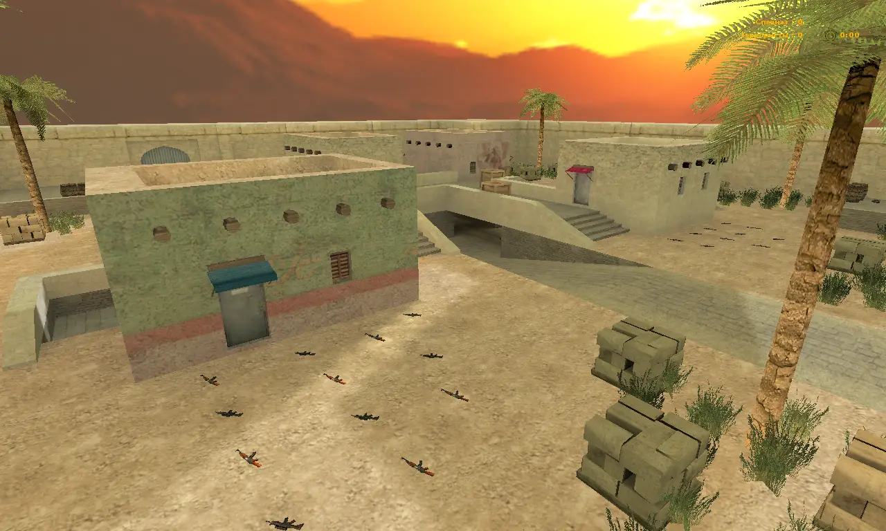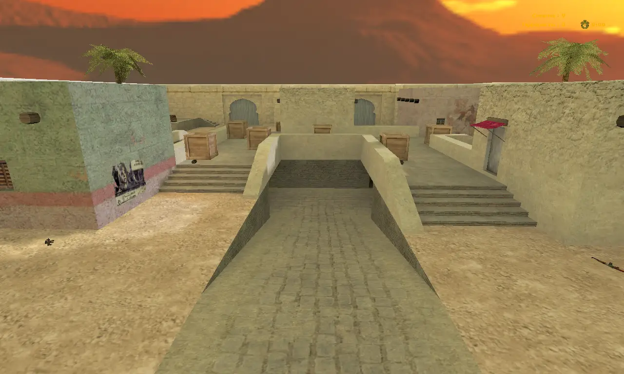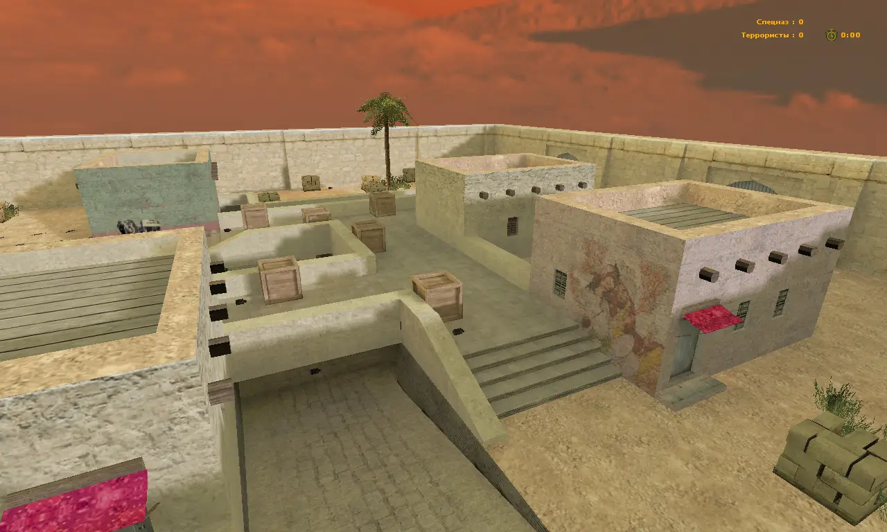 Карта aim_arres2014 для CS 1.6 - средних размеров aim локация в арабском стиле, больше всего напоминающую стиль de_tuscan, пальмы, паллеты с камнями и песочное покрытие хорошо передают атмосферу арабского стиля.