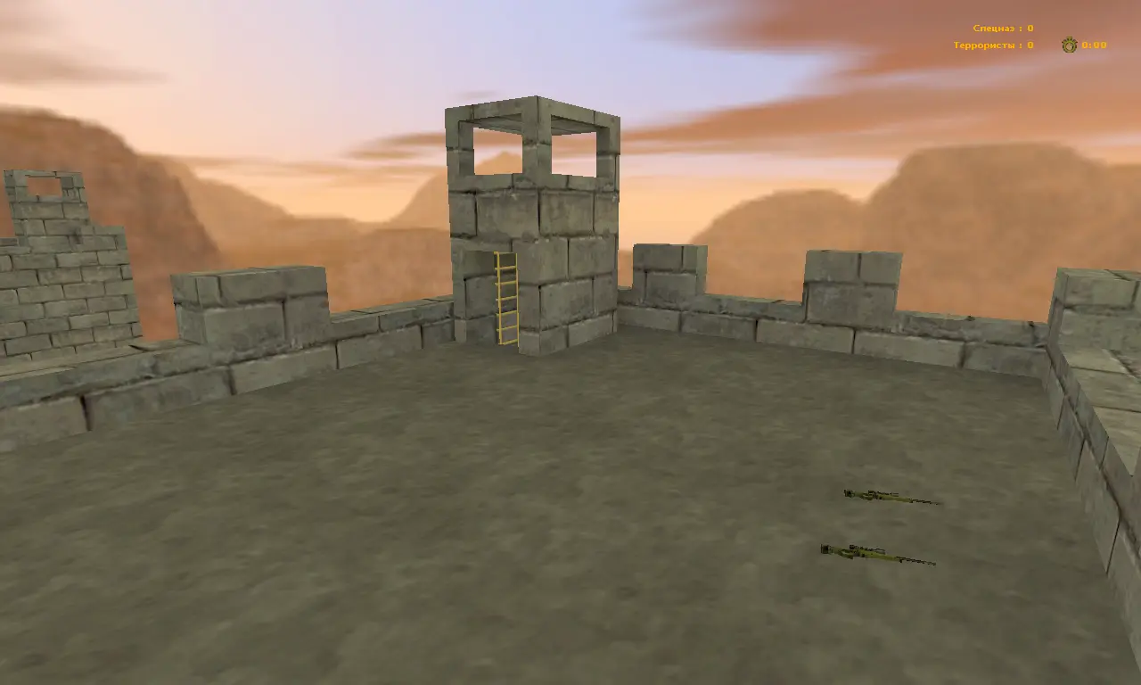 Карта awp_tower_war для CS 1.6 - две одинаковые и достаточно широкие крепости на против друг друга в которых есть комнаты и различные объекты, а так же выход на крышу сооружения. Очень интересная и необычная локация которая проверит ваш скилл игры с AWP.