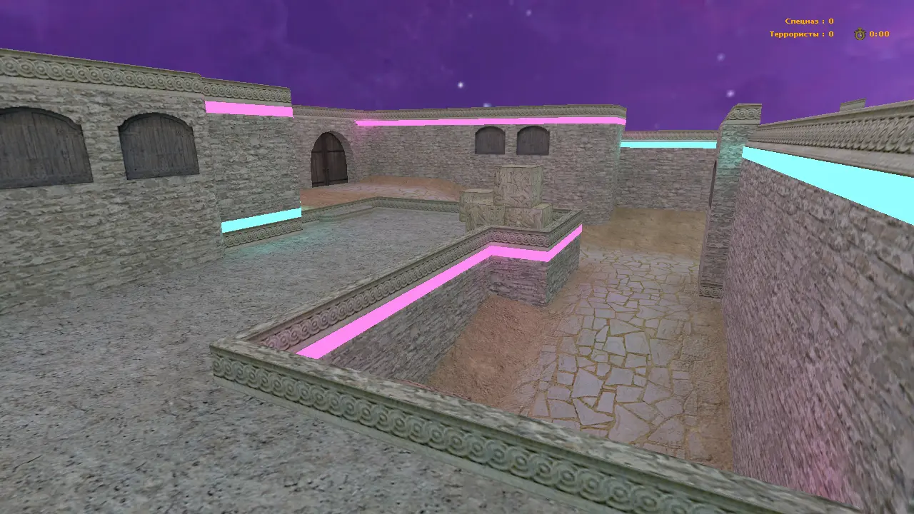 Карта de_dust2_oldgods для CS 1.6 - одна из красивейших вариаций классической Dust2, на этот раз мододелы решили приправить карту "киберпанковостью" добавив по всем стенам неоновые полосы, голубого и розового цвета. Самое интересное что привычные текстуры стен были заменены на те что используются в карте Aztec, а пол остался прежним и всё это вместе смотрится очень гармонично, ну и обратите внимание на сочную текстуру неба, в космическом стиле.